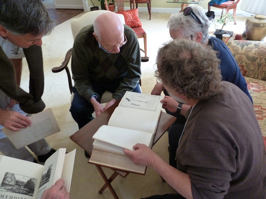 Joe Gall [1], a member of my PhD thesis committee at Yale University and one of the major figures in modern cell biology, turned 85 in 2013. A symposium to celebrate his birthday was held at the Carnegie Institution in Baltimore, where Joe had moved from Yale in 1983. After the Symposium, Joe and his wife Diane Dwyer had a luncheon at their house for the Symposium attendees. Most of the attendees left for home later in the afternoon. Several of us who were not leaving until the next day spent the rest of the afternoon at Joe’s and Diane’s house and went to dinner together that evening. Joe wrote the introduction to the Lenhoff’s translation of the Memoires. Interestingly, he told me the following that afternoon: “As I mentioned when you were here, I began to translate it some time before I learned that Howard Lenhoff had already begun the same project. I was happy to let him finish, since he clearly had more hands-on experience with Hydra and could better understand some of the more difficult passages. It also led to a long friendship and my attendance at a symposium in Geneva where I presented the one study I ever did on Hydra.” [2] Joe was an avid collector of rare books and he owned a copy of the Memoires, which he showed us that afternoon. Below is a photo of me at Joe’s house looking at his copy of the Memoires. Left to right in the photo are Rahul Warrior, Joe, Liz Rogers, and me.